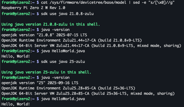 I prepared a Raspberry Pi Zero 2 for the previous blog post, so took it out of my “experimentation box” to reproduce the problem. With the Java 24 version, installed at that time, the problem still exists. You can run java