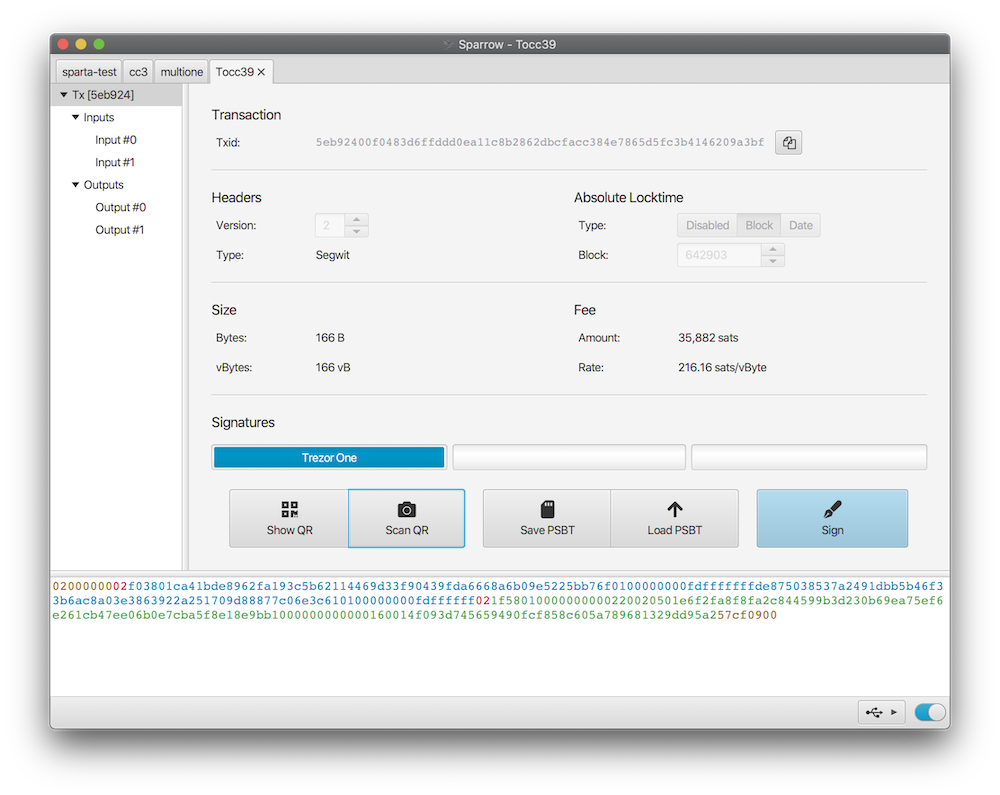 Sparrow supports all the features you would expect from a modern Bitcoin wallet, however, it is also unique in that it contains a fully featured transaction editor that also functions as a blockchain explorer. This feature not only allows editing of all transaction’s fields, but also allows you to easily inspect the transaction bytes before broadcasting.